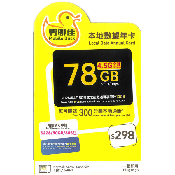 鴨聊佳--中國移動4.5G香港365日 78GB上網+2000分鐘《購買2張免費順豐》上網卡數據卡Sim卡電話咭data